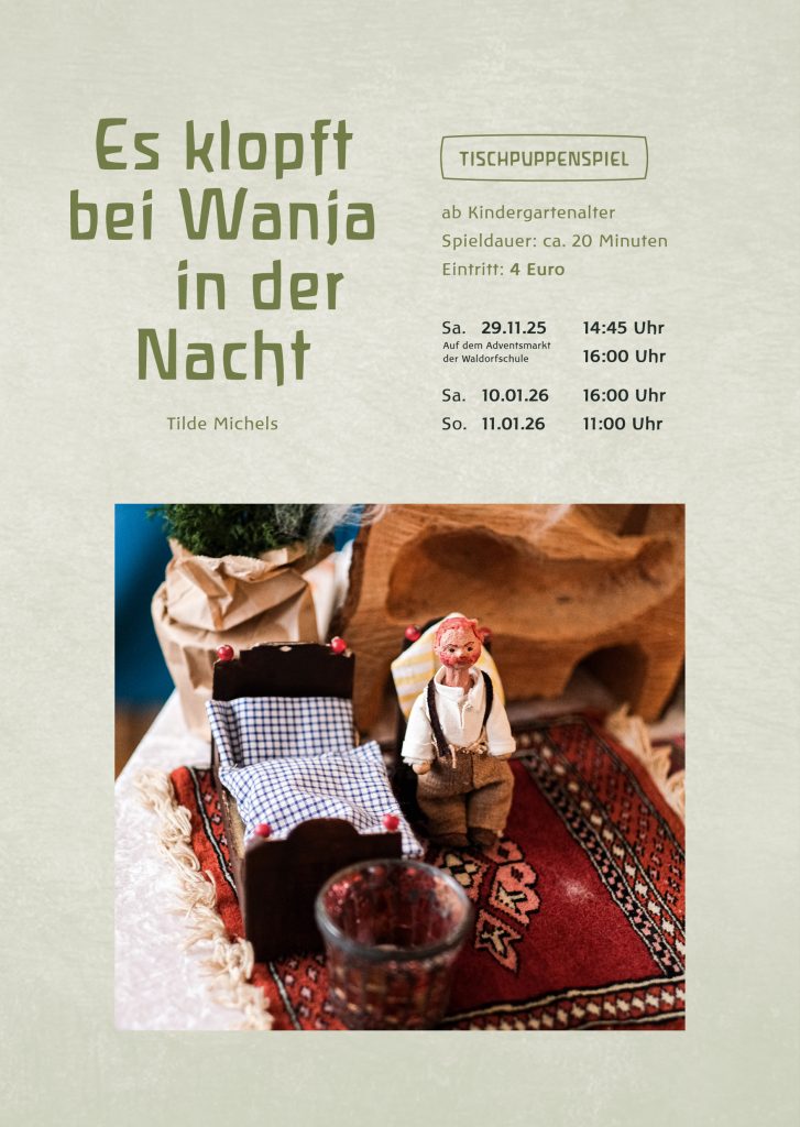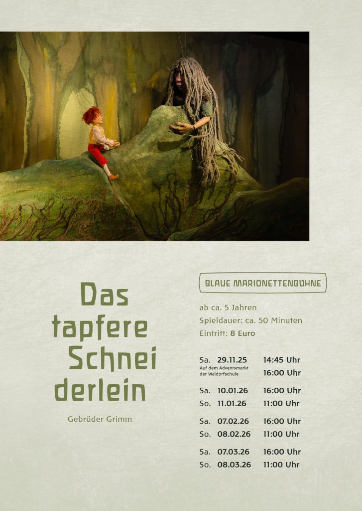 Die Marionettenspiele empfehlen wir ab etwa 5 Jahren bis zur 3. Klasse, die Tischpuppenspiele ab etwa 3 Jahren. Eintrittskarten sind 30 Minuten vor Vorstellungsbeginn im Schulfoyer erhältlich. Wir bitten um Verständnis, dass Kartenreservierungen leider nicht möglich sind.